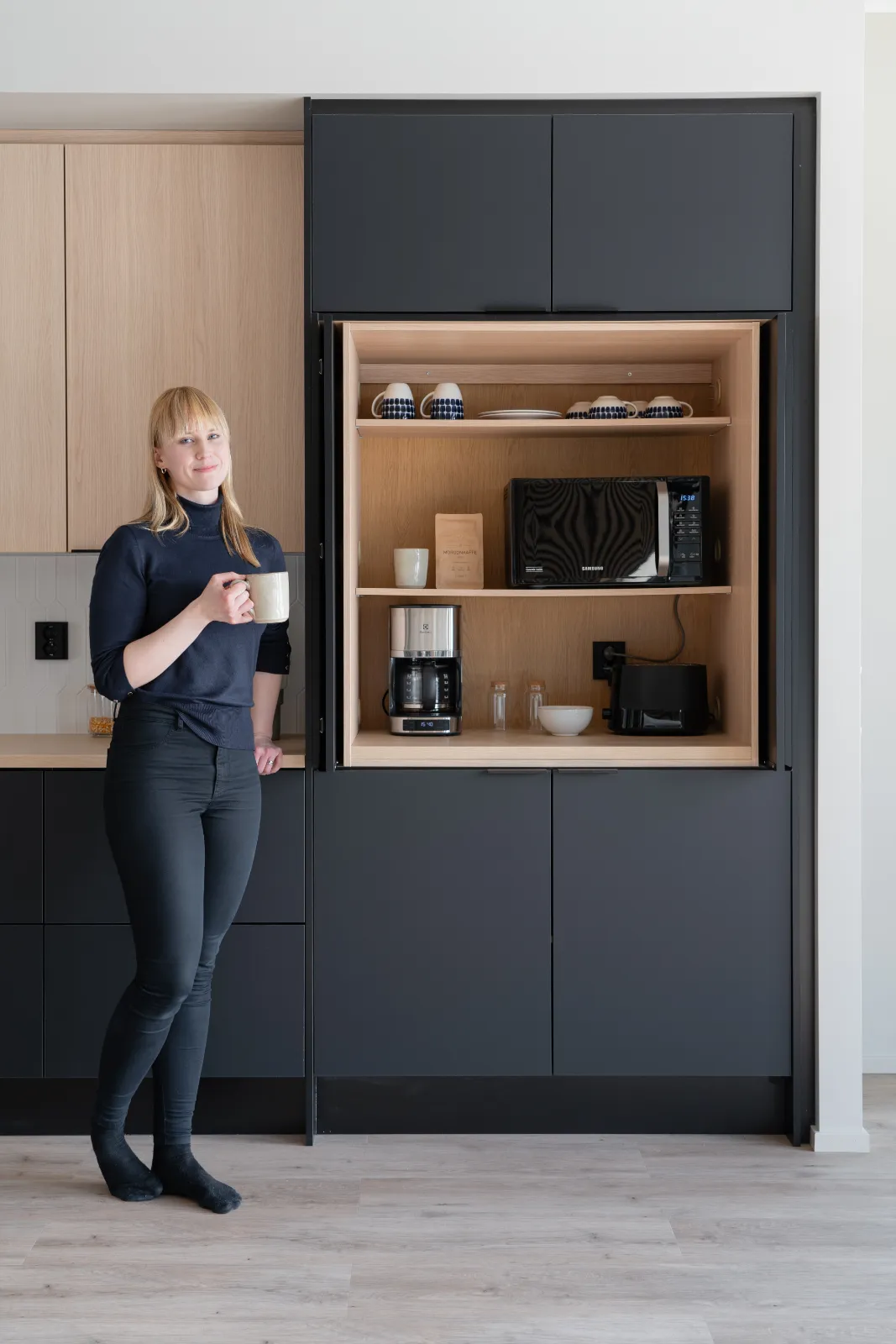 Aamiaiskaappi voidaan räätälöidä täysin tarpeiden mukaan. Se voi toimia esimerkiksi kahvinurkkauksena, kuivakaappina, leivontapisteenä tai monikäyttöisenä säilytysratkaisuna.